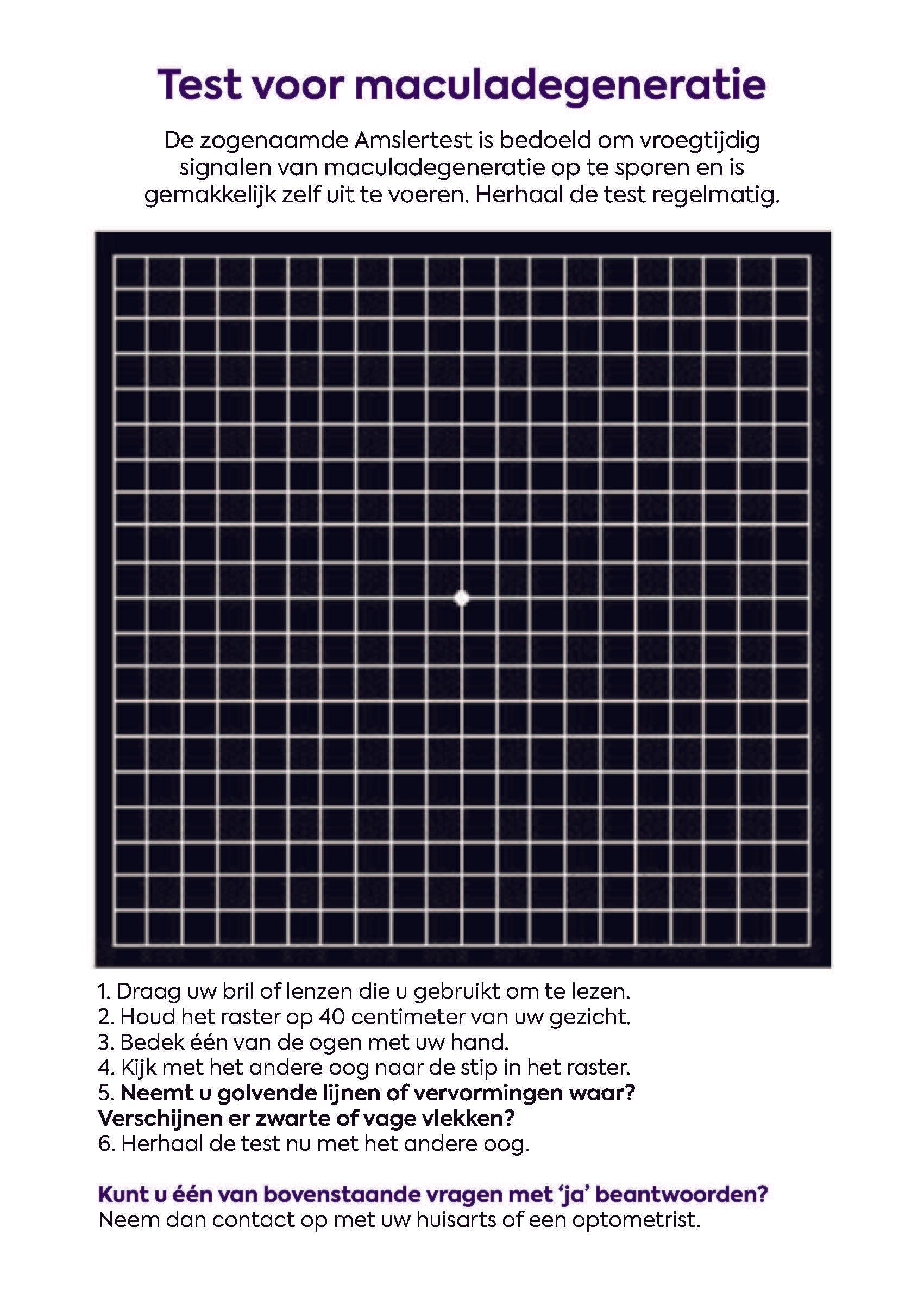 Houd de testkaart op ongeveer 40 cm afstand, bedek één oog en focus op de stip in het midden van het raster. Herhaal met het andere oog. Vallen er lijnen op die vervormd lijken, of ziet u vlekken? Dan is het verstandig om contact op te nemen met uw huisarts of optometrist.